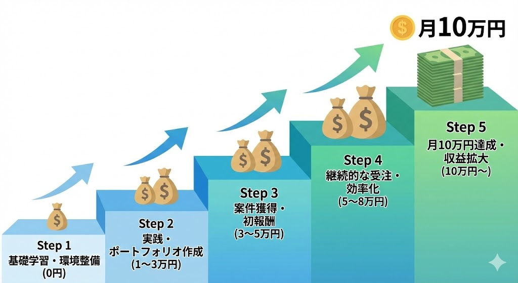 ここでは、最も再現性が高い**「AIライティング×クラウドソーシング」**を例に、月10万円へのロードマップを解説します。