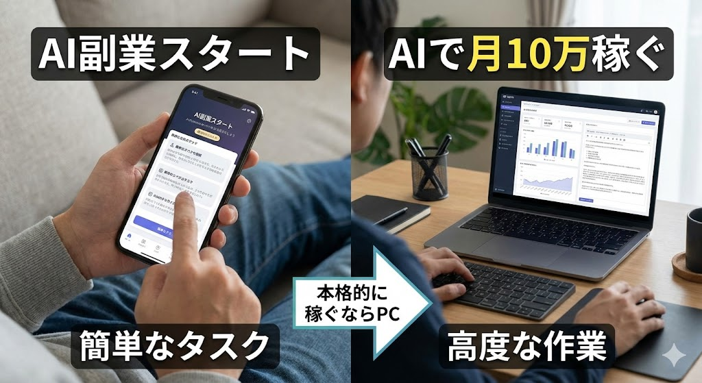 結論から言うと、**「スマホだけで月1〜3万は可能だが、月10万を目指すならPCは必須」**です。